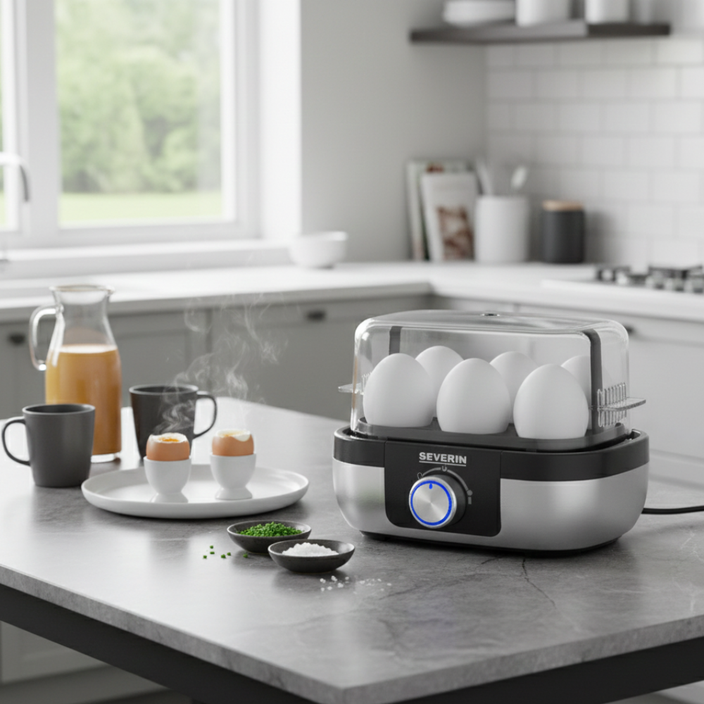 - Diseño de calidad en acero inoxidable para hasta 6 huevos (S-XL)